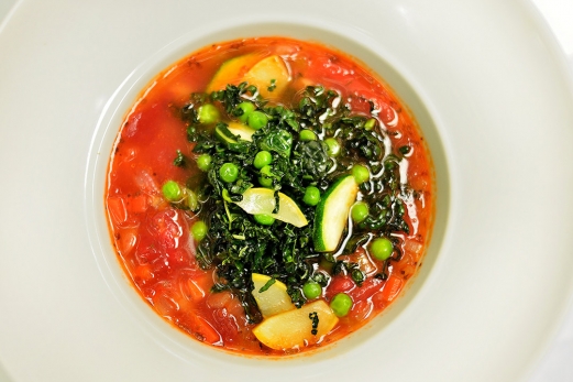 Spring vegetable minestrone with cannellini beans, zucchini and kale.