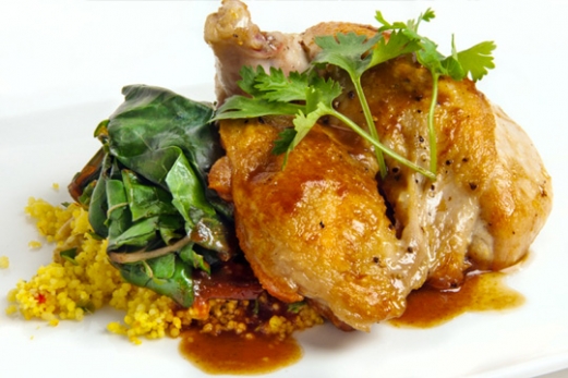 Savor the flavors of North Africa with this Moroccan chicken dish. Sourced from Griggstown Farm, the hormone- and antibiotic-free chicken is accompanied by Swiss chard and couscous with golden raisins, scallions, sweet red peppers and toasted pine nuts.