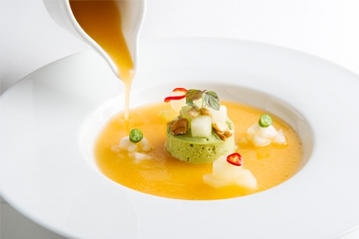 Chilled Sugar Queen melon soup with a frozen Matcha tea soufflé, cashews, candied jalapeño and compressed melons.