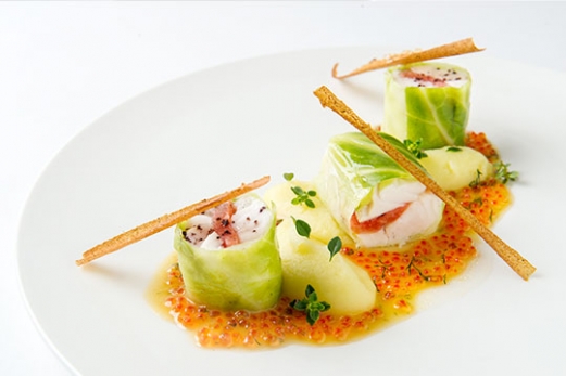 Poached roulade of walleye pike wrapped in white cabbage over a lemon potato purée and parsley root broth with trout roe.